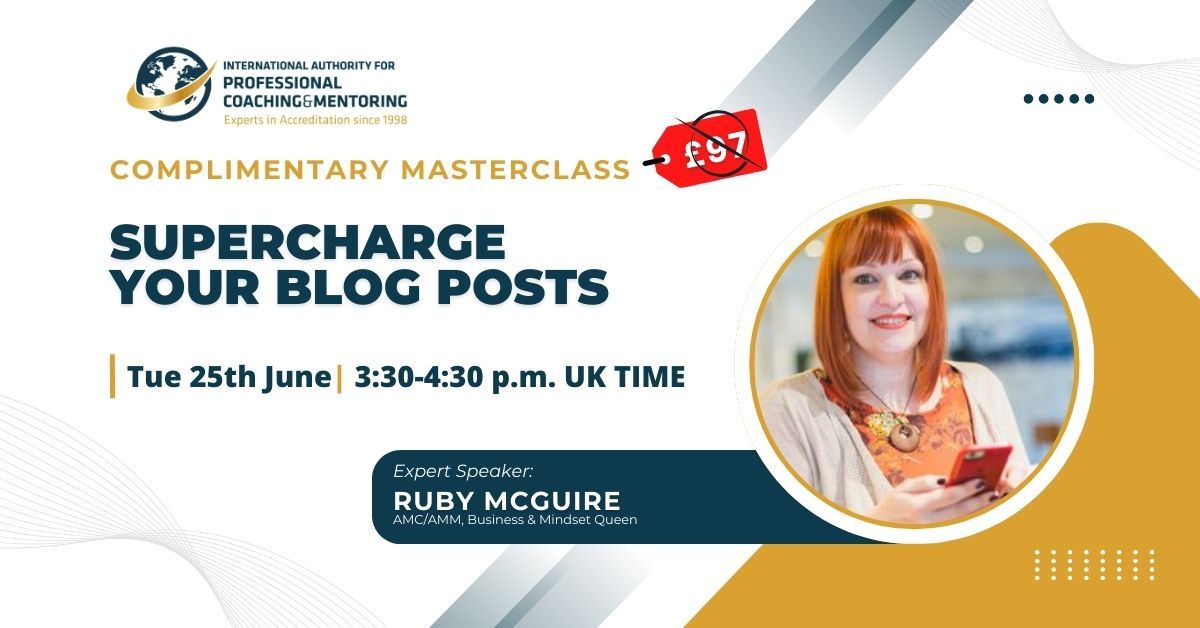 Join us for an exclusive masterclass,  Supercharge Your Blog Posts featuring our expert guest speaker, Ruby McGuire, IAPC&M Accredited Master Coach and Mentor, and Business & Mindset Queen.